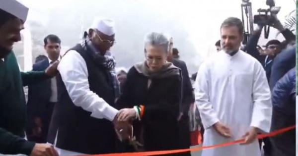 कांग्रेस अध्यक्ष श्री @kharge, CPP चेयरपर्सन श्रीमती सोनिया गांधी जी और नेता विपक्ष श्री @RahulGandhi ने कांग्रेस के नए मुख्यालय ‘इंदिरा भवन’ का उद्घाटन किया।