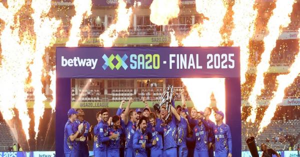 जोहानिसबर्ग। पिछली दो बार आखिरी स्थान पर रही एमआई केपटाउन ने राशिद खान की कप्तानी में तीसरे सत्र में चमत्कारिक प्रदर्शन करते हुए दो बार की चैम्पियन सनराइजर्स ईस्टर्न केप को वांडरर्स पर खेले गए फाइनल में बेहतरीन गेंदबाजी के दम पर 76 रन से हराकर एसए 20 खिताब अपने नाम किया । कैगिसो रबाडा ने जैसे ही 19वें ओवर की चौथी गेंद पर रिचर्ड ग्लीसन को आउट किया, मैदान पर आये 22000 से ज्यादा दर्शकों के बीच एमआई के नीले झंडे लहराते दिखाई देने लगे। पूरा स्टेडियम अपने स्थानीय नायक ‘रबाडा रबाडा’ के शोर से गूंज उठा जिन्होंने 3.4 ओवर में 25 रन देकर चार विकेट लिये।