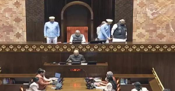 नेता प्रतिपक्ष मल्लिकार्जुन खरगे कुछ कहना चाहते थे लेकिन सभापति ने इसकी अनुमति नहीं दी। धनखड़ ने कहा कि भारत की प्रथम नागरिक और राष्ट्रपति पद पर आसीन पहली आदिवासी महिला का संदेश है यह और इसे सदन में पेश न होने देना उनका अपमान होगा। उन्होंने कहा, ‘‘मैं इसकी अनुमति नहीं दूंगा।’’ धनखड़ ने हंगामा कर रहे सदस्यों से व्यवस्था बनाए रखने की अपील की और उन्हें कार्रवाई की चेतावनी भी दी। हंगामा जारी रहते देख उन्होंने 11 बजकर 09 मिनट पर सदन की कार्यवाही 11 बजकर 20 मिनट तक स्थगित कर दी।