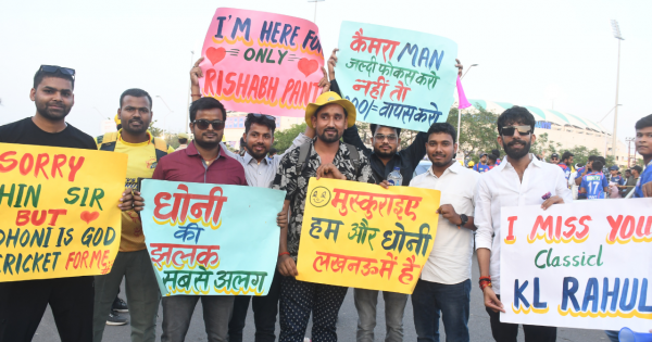 धोनी के लिए लोगों की दीवानगी इस कदर थी कि वे चार्ट पेपर पर तरह-तरह के स्लोगन लिखकर पहुंचे थे। राजधानी के निवासी दीपक पाठक ने पोस्टर पर लिखा- हम लखनऊ वाले बेवफा नहीं, मगर धोनी से हमें प्यार है…। वहीं मैच देखने पहुंची एक युवती ने अपने चार्ट पेपर पर लिखा-जीत या हार कम नहीं होगा धोनी से प्यार। उसके साथ मौजूद युवती ने लिख रखा था न गुस्सा न शोर माही है दिलों का चोर। वहीं मेरठ से युवक ने मुस्कुराइए हम और धोनी लखनऊ में है। तो वहीं लखनऊ के एक युवक ने एलएसजी के समर्थन में अपने चार्ट पर आई एम हियर फॉर ओनली रिषभ पंत लिख रखा था। जिला बहराइच से आए हारुन न जीत से, न हार से, खुशी मिलती है तो सिर्फ माही के दीदार से लिख रखा था। एक समर्थक ने लिखा कि घायल शेर वापस आ गया यह आवाज आई। दिल ने मुझसे कहा लो आ गया माही…