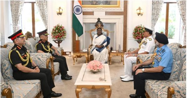 राष्ट्रपति भवन ने ‘एक्स’ पर लिखा, ‘‘प्रमुख रक्षा अध्यक्ष जनरल अनिल चौहान, थलसेना प्रमुख जनरल उपेंद्र द्विवेदी, वायु सेना प्रमुख एयर चीफ मार्शल ए. पी. सिंह एवं नौसेना प्रमुख एडमिरल दिनेश के. त्रिपाठी ने राष्ट्रपति द्रौपदी मुर्मू से मुलाकात की और उन्हें ‘ऑपरेशन सिंदूर’ संबंधी जानकारी दी।’’ राष्ट्रपति ने सशस्त्र बलों की उस वीरता और समर्पण की सराहना की जिसके कारण आतंकवाद के विरुद्ध प्रतिक्रिया के दौरान भारत को शानदार सफलता मिली।