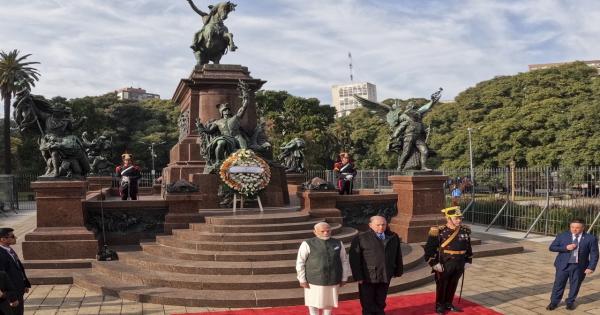इस स्मारक का निर्माण 1862 में फ्रांसीसी मूर्तिकार लुईस जोसेफ डौमास ने किया था। समारोह के बाद मोदी का स्वागत यहां अर्जेंटीना सरकार के मुख्यालय कासा रोसाडा में राष्ट्रपति हावियर मिलेई ने किया। वे द्विपक्षीय बैठक के लिए यहां पहुंचे थे। मोदी शुक्रवार शाम को दो दिवसीय यात्रा पर अर्जेंटीना पहुंचे।