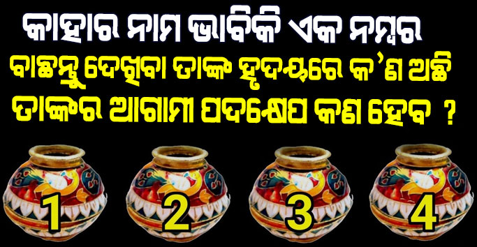 ଆପଣ ଯଦି କୌଣସି ବ୍ୟକ୍ତିଙ୍କର ମନର କଥା ଆପଣଙ୍କ ପାଇଁ କଣ ଅଛି ଜାଣିବାକୁ ଚାହୁଁଥାନ୍ତି । ତେବେ ଆପଣଙ୍କୁ ଦିଆଯାଇଥିବା 4 ଟି କଳସ ମଧ୍ୟରେ ଥିବା ଯେକୌଣସି ଗୋଟିଏ ନମ୍ବରକୁ ବାଛନ୍ତୁ । ଯଦି ଆପଣ ଚାହୁଁଥାନ୍ତି । ତେବେ 4 ଜଣ ବ୍ୟକ୍ତିଙ୍କ ପାଇଁ 4 ଟି ଅଲଗା ଅଲଗା ନମ୍ବର ମଧ୍ୟ ବାଛି ଚୟନ କରିପାରିବେ । ଏହା ସହିତ ସେହି ନମ୍ବର ଅନୁସାରେ ସେହି ବ୍ୟକ୍ତିର ମନର କଥା ଜାଣିବାକୁ ପାଇବେ ।