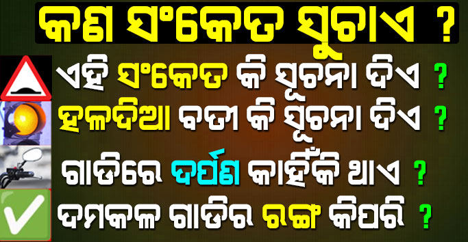 ଯାହା ଆପଣ ମାନେ ସହଜରେ ଜାଣି ପାରିବେ । ଆଜିର ଆମର ବିଷୟ ବସ୍ତୁ ଟ୍ରାଫିକ ନିୟମ କୁ ନେଇ ରହିଛି । ତେବେ ଆସନ୍ତୁ ଆରମ୍ଭ କରିବା ଆଜିର ପ୍ରଶ୍ନ ଓ ଉତ୍ତର । ୧- ଗାଡି ରହିବା ପାଇଁ କେଉଁ ଟ୍ରାଫିକ ଆଲୁଅ ସଂକେତ ଦିଏ ?