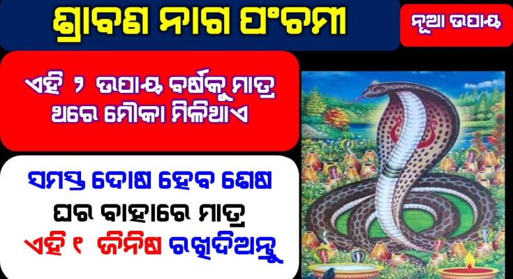 ବନ୍ଧୁଗଣ ଶ୍ରାବଣ ମାସର ଶୁକ୍ଲପକ୍ଷ ପଞ୍ଚମୀ ତିଥିକୁ ନାଗପଞ୍ଚମୀ ରୂପରେ ପାଳନ କରାଯାଏ | ସନାତନ ଧର୍ମରେ ନାଗଙ୍କର ପୂଜା ବହୁତ ମହତ୍ୱପୁର୍ଣ ହୋଇଥାଏ | ବିଶେଷ କରି ନାଗପଞ୍ଚମୀ ଵାଲା ଦିନ | ନାଗପଞ୍ଚମୀ ଦିନଟିକୁ ମହାଦେବଙ୍କ ଆଭୂଷଣ ରୂପରେ ନାଗ ଦେବତାଙ୍କର ପୂଜା କରାଯାଏ | ନାଗଦେବତାଙ୍କ ପୂଜା କରିବା ଦ୍ୱାରା ଆଧ୍ୟାତମକତା ଶକ୍ତି ବଢିଥାଏ | ଧନ ସମ୍ପତିର ଅପାର ବର୍ଷା ହୋଇଥାଏ | ଏବଂ ମନର ସମସ୍ତ ଇଛା ପୁର୍ଣ ହୋଇଥାଏ ଯଦି ଆମେ ନାଗପଞ୍ଚମୀରେ ନାଗ ଦେବତାଙ୍କୁ ସବୁ ଵିଧି ବିଧାନରେ ପୂଜା କରିବା | ଆମେ ଆଜି ଆପଣଙ୍କୁ ଏହା କହିବାକୁ ଯାଉଛୁ ଯେ କିପରି ଆପଣ ନାଗପଞ୍ଚମୀରେ କେମିତି ନାଗଦେବତାଙ୍କର ପୂଜା କରିବେ | ଆମକୁ କଣ ଏମିତି ବିଶେଷ କାର୍ଯ୍ୟ କରିବାକୁ ହେବ ଯଦି ଆମେ କାଳସର୍ପ ଦୋଷରେ ପୀଡିତ ଅଛେ କିମ୍ଭା ଯଦି ଆପଣ ଘରେ ଧନ ସମ୍ପତି ପ୍ରାପ୍ତ କରିବାକୁ ଚାହୁଁଥିବେ | ମା ଲଷ୍ମୀଙ୍କ କୃପା ଚାହୁଁଛନ୍ତି ତେବେ ଆମକୁ କଣ କରିବାକୁ ହେବ | କଣ ଉପାୟ କରିବାକୁ ହେବ ଚାଲନ୍ତୁ ଜାଣିବା |