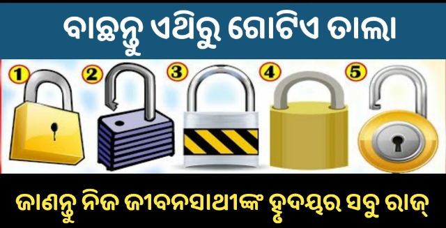 କୌଣସି ବ୍ୟକ୍ତିର ଚିନ୍ତାଧାରା ତାର ବିଚାର ଏବଂ ସ୍ଵଭାବର ଅାଇନା ହୋଇଥାଏ। ତାକୁ କଣ ପସନ୍ଦ ବା ପସନ୍ଦ ନୁହେଁ, ଏହାର ସ୍ଵଭାବ ବିଷୟରେ ଜଣା ପଡିଥାଏ। ଆଜି ଆପଣଙ୍କୁ ପାଞ୍ଚଟି ଅଲଗା ଅଲଗା ପ୍ରକାରର ତାଲା ଦେଖା ଯିବ, ଯେଉଁଥିରେ ଆପଣଙ୍କୁ ନିଜ ପସନ୍ଦର ତାଲା ବାଛିବାକୁ ହେବ। ଏହି ତାଲା କରିବ ଆପଣଙ୍କ ପାର୍ଟନରଙ୍କ ହୃଦୟରେ ଗୁପ୍ତ କଥା। ଏଥିପାଇଁ ଆପଣଙ୍କୁ ପାଞ୍ଚ ସେକେଣ୍ଡ ଦିଆଯିବ। ଆମେ ଆପଣଙ୍କୁ ବାଛିଥିବା ତାଲା ମଧ୍ୟରୁ ଆପଣଙ୍କ ପାର୍ଟନରଙ୍କ ଗୁପ୍ତ କଥା କହିବୁ। ତେବେ ବାଛନ୍ତୁ ଗୋଟେ ତାଲା ଜାଣନ୍ତୁ ନିଜ ପାର୍ଟନରଙ୍କ ବିଷୟରେ।