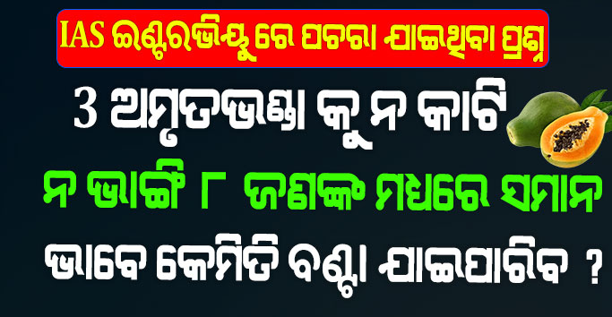 IAS ଇଣ୍ଟରଭିୟୁ ରେ ପଚରା ଯାଇଥିବା ପ୍ରଶ୍ନ- ଅମୃତଭଣ୍ଡା କୁ ନ କାଟି ନ ଭାଙ୍ଗି 8 ଲୋକଙ୍କ ମଧ୍ୟରେ ସମାନ କେମିତି ବଣ୍ଟା ଯାଇପାରିବ ?