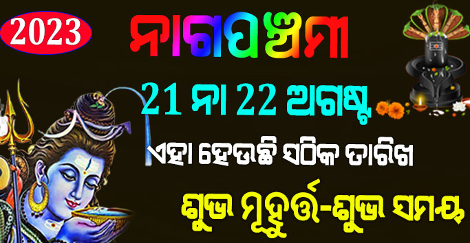 ୨୦୨୩ ବର୍ଷ ନାଗ ପଞ୍ଚମୀ ର ପର୍ବ ୨୧ ଅଗଷ୍ଟ ରେ ପାଳିତ ହେବାକୁ ଯାଉଛି । ନାଗ ପଞ୍ଚମୀ ର ଶୁଭ ମୂହୁର୍ତ୍ତ ହେଉଛି ୨୧ ଅଗଷ୍ଟ ସକାଳ ୬:୧୦ ମିନିଟ ରୁ ଆରମ୍ଭ ହୋଇ ୮:୩୮ ମିନିଟ ରେ ସେସ ହେବ । ପଞ୍ଚମୀ ତିଥି ର ଆରମ୍ଭ ହେବ ୨୧ ଅଗଷ୍ଟ ସକାଳ ୧୨:୨୧ ମିନିଟ ଓ ସମାପ୍ତ ହେବ ୨୨ ଅଗଷ୍ଟ ପ୍ରାତଃ କାଳ ୨ଟା ସମୟରେ । ଧାର୍ମିକ ମାନ୍ୟତା ଅନୁଯାୟୀ ନାଗ ପଚାମି ଦିନ ପ୍ରାତଃ କାଳ ରୁ ସ୍ବଚ୍ଛ ବସ୍ତ୍ର ଧାରଣ କରି କରନ୍ତୁ ।