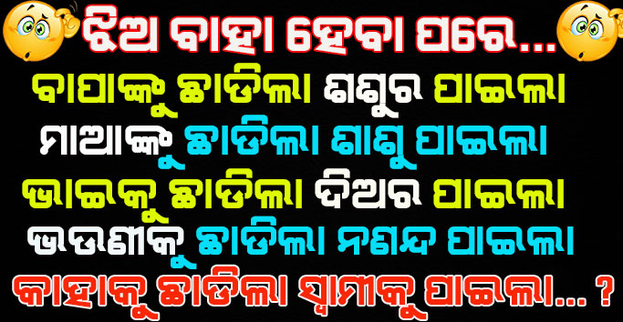 10- ଝିଅ ବାହା ହେବା ପରେ ସେ ତାହାର ବାପାଙ୍କୁ ଛାଡିକି ଆସିଲା ଶଶୁର ପାଇଲା । ମାଆଙ୍କୁ ଛାଡିକି ଆସିଲା ଶାଶୁ ପାଇଲା । ଭାଇକି ଛାଡିକି ଆସିଲା ଦିଅର ଆସିଲା । ଭଉଣୀକୁ ଛାଡିକି ଆସିଲା ନଣନ୍ଦ ପାଇଲା । ହେଲେ ସେ କାହାକୁ ଛାଡିକି ଆସିଲା ସ୍ଵାମୀ ପାଇଲା ?