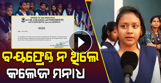 ନମସ୍କାର ବନ୍ଧୁଗଣ । ସୂଚନା ଅନୁସାରେ ବୟଫ୍ରେଣ୍ଡ ନଥିଲେ କଲେଜ ମନା । ହଁ ବନ୍ଧୁଗଣ ସୂଚନା ଅନୁସାରେ ଏପରି ଏକ ନୋଟିସ କଲେଜରେ ଦେଖିବାକୁ ମିଳିଛି । ତେବେ ସେହି କଲେଜର ଛାତ୍ରୀ ମାନେ ଏହାକୁ ଘୋର ବିରୋଦ୍ଧ କରିଛନ୍ତି । ତେବେ ଏପରି ଘଟଣା SVM କଲେଜ ଅଟୋନୋମସ ଜଗତଶିଙ୍ଘପୁର ଠାରେ ଦେଖିବାକୁ ମିଳିଛି । ତେବେ ସେହି କଲେଜରେ ପଢୁଥିବା ଜଣେ ଛାତ୍ରୀଙ୍କର କହିବା ଅନୁଯାଇ ତାଙ୍କ କଲେଜରେ ନୋଟିସରେ ବାହାରିଛି ।