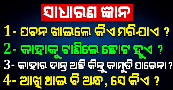 ନମସ୍କାର ବନ୍ଧୁଗଣ, ମଣିଷ ଦୁନିଆର ସର୍ବ ଶ୍ରେଷ୍ଠ ପ୍ରାଣୀ ହେଲେ ମଧ୍ୟ ଅନେକ ପ୍ରଶ୍ନର ଉତ୍ତର ଆମ ପାଖରେ ନ ଥାଏ । ଯେଉଁ ପ୍ରଶ୍ନର ଉତ୍ତର ଜାଣିବା ପାଇଁ ଆମ ମନରେ ଜିଜ୍ଞାସା ଭରି ହୋଇ ରହିଥାଏ । ଆପଣଙ୍କ ପିଲା ମାନଙ୍କ ଜ୍ଞାନକୁ ଆପଣ ମାନେ ଏହି ପ୍ରଶ୍ନ ଦ୍ଵାରା ବୃଦ୍ଧି କରାଇ ପାରିବେ । ଆଜିର ସମୟରେ ଭଲ ଚାକିରି କରିବା ପାଇଁ ବ୍ୟକ୍ତିଙ୍କ ମଧ୍ୟରେ ଦକ୍ଷତା ସହ ସାଧାରଣ ଜ୍ଞାନ ରହିବା ମଧ୍ୟ ଅତ୍ୟନ୍ତ ଗୁରୁତ୍ୱପୂର୍ଣ୍ଣ ।
