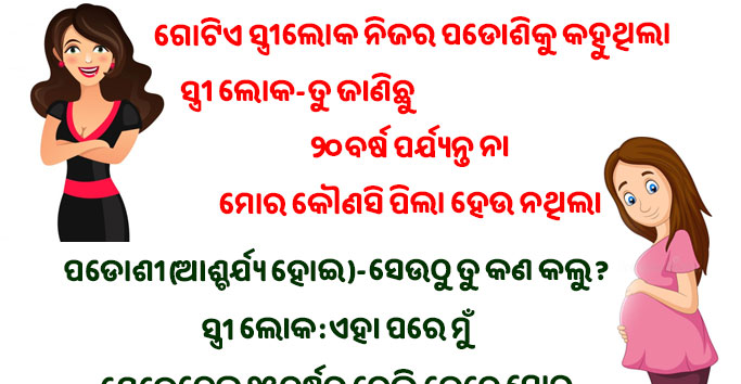 ଓଡିଆ ଜୋକ୍ସ: ଗୋଟିଏ ସ୍ତ୍ରୀଲୋକ ନିଜର ପଡୋଶିକୁ କହୁଥିଲା- ତୁ ଜାଣିଛୁ ୨୦ ବର୍ଷ ପର୍ଯ୍ୟନ୍ତ ନା ମୋର କୌଣସି ପିଲା ହେଉ ନଥିଲା, ପଡୋଶୀ ଆଶ୍ଚର୍ଯ୍ୟରେ- ସେଉଠୁ ତୁ କଣ କଲୁ ?