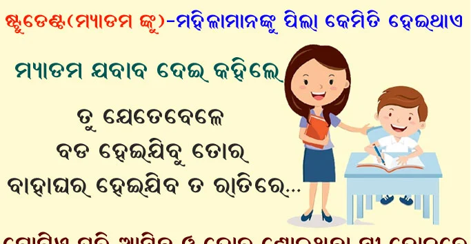 Odia Jokes- ଷ୍ଟୁଡେଣ୍ଟ (ମ୍ୟାଡମ ଙ୍କୁ)- ମହିଳାମାନଙ୍କର ପିଲା କେମିତି ହୋଇଥାଏ ? ମ୍ୟାଡମ- ତୁ ଯେତେବେଳେ ବଡ ହେଇଯିବୁ ଓ ତୋର ବାହାଘର ହେଇଯିବ ତ ରାତିରେ ….