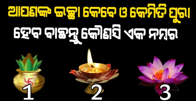ବନ୍ଧୁଗଣ ପ୍ରତେକ ମଣିଷ ର କିଛି ନା କିଛି ଇଚ୍ଛା ରହିଥାଏ । କିନ୍ତୁ ଅନେକ ସମୟରେ ଏମିତି କିଛି ଇଚ୍ଛା ରହିଥାଏ ଯାହା କେବେ ପୂରଣ ହେବ ତାହାକୁ ନେଇ ମଣିଷ ଚିନ୍ତାରେ ପଡିଯାଏ । ଆଜି ଆମେ ଆପଣଙ୍କ ପାଇଁ ସୁନ୍ଦର ବିଷୟ ଅବସ୍ତୁ ଟି ନେଇ ଆସିଛୁ । ଆମର ବିଷୟ ବସ୍ତୁ ଟି ହେଉଛି ଆପଣଙ୍କର ଇଚ୍ଛା କେବେ ଓ କେମିତି ପୁରା ହେବ । ଏଥିପାଇଁ ଆପଣଙ୍କୁ 3ଟି ଚିତ୍ର ମଧ୍ୟରୁ କୌଣସି ଗୋଟିଏ ବାଛିବାକୁ ହେବ । ଏଥିପାଇଁ ଆପଣଙ୍କୁ ମାତ୍ର 5 ସେକେଣ୍ଡ ର ସମୟ ଦିଆଯିବ । ଆପଣ କାହାର ନାମ ନେଇ ବାଛନ୍ତୁ 3ଟି ନମ୍ବର ମଧ୍ୟରୁ କୌଣସି ଗୋଟିଏ ।