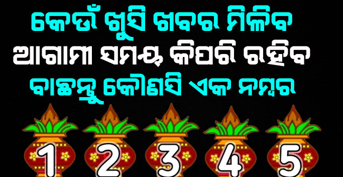 ଆପଣଙ୍କ ଜୀବନରେ ଆଗକୁ ଆସୁଥିବା 30 ଦିନ ସମୟ ମଧ୍ୟରେ କେଉଁ ପ୍ରକାର ଖୁସି ମିଳିବାକୁ ଯାଉଛି । ଆପଣଙ୍କୁ ଏଠାରେ 1, 2, 3, 4 ଓ 5 ନମ୍ବର ଦିଆଯାଇଛି । ଏଥିମଧ୍ୟରୁ କୌଣସି ଗୋଟିଏ ନମ୍ବର ବାଛି ଆପଣଙ୍କୁ କେଉଁ ପ୍ରକାର ଖୁସି ଖବର ମିଳିବାକୁ ଯାଉଛି ତାହା ଜାଣିପାରିବେ । ତେଣୁ ବିଶ୍ବାସର ସହ କୌଣସି ଗୋଟିଏ ନମ୍ବରକୁ ନିଜ ପାଇଁ ଚୟନ କରନ୍ତୁ ଏବଂ ସେହି ନମ୍ବର ଅନୁଯାଇ ଆପଣଙ୍କ ସମୟ କିଭଳି ରହିବାକୁ ଯାଉଛି ତାହା ଜାଣନ୍ତୁ ।