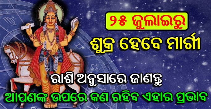 ଶୁକ୍ର ଗ୍ରହ ଭୋଗ ବିଳାଶ ସହିତ ଦାମ୍ପତ୍ୟ ସୁଖ ଓ ପ୍ରେମ ସମ୍ବନ୍ଧର ବି ପ୍ରଦୀନିଧି ଗ୍ରହ ଅଟେ । ଏହି ଗ୍ରହ ୨୫ ଜୁଲାଇକୁ ମାର୍ଗୀ ହେବାକୁ ଯାଉଛି । ଶୁକ୍ର ୧୩ ମେ ରୁ ବକ୍ରୀ ଚାଲୁଛନ୍ତି । ଏହି ସମୟରେ ଲୋକମାନଙ୍କ ଦାମ୍ପତ୍ୟ ଜୀବନ ଓ ପ୍ରେମ ସମ୍ବନ୍ଧରେ ବିଭିନ୍ନ ଅସୁବିଧା ଆସିଥିଲା । କେତେକ ଲୋକମାନଙ୍କ ବିବାହ ଭାଙ୍ଗି ଯିବାର କଥା ବି ଉଠିଥିଲା । କିନ୍ତୁ ବର୍ତ୍ତମାନ ଆଉ ଭୟ କରିବାର ନାହିଁ କାରଣ ଶୁକ୍ର ମାର୍ଗୀ ହେବା ଦ୍ଵାରା ଏହିଭଳି ସମସ୍ୟା ସବୁ ଦୂର ହୋଇଯିବ । ଏହା ସହିତ ଭୌତିକ ସୁଖ ସୁବିଧାରେ ବି ବୃଦ୍ଧି ହେବ । ଆର୍ଥିକ ସଙ୍କଟ ଦୂର ହେବ ।