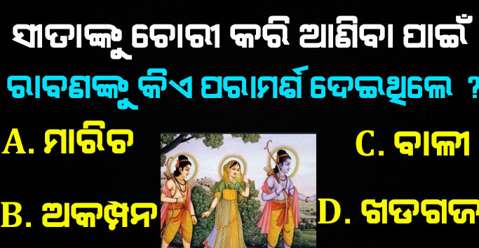 ଉତ୍ତର;- ସୀତାଙ୍କୁ ଚୋରୀ କରି ଆଣିବା ପାଇଁ ପ୍ରଥମେ ରାବଣଙ୍କୁ ଅକମ୍ପନଦୈତ୍ୟ ପରାମର୍ଶ ଦେଇଥିଲେ ।