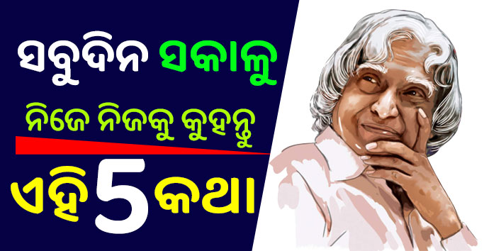 ଅବଦୁଲ କଲାମ କହିଥିଲେ କି ନିଦରେ ଦେଖିଥିବା ସ୍ଵପ୍ନ ସ୍ଵପ୍ନ ନୁହେଁ । ସ୍ଵପ୍ନ ସେଇଟା ଅଟେ ଯାହାଦ୍ୱାରା କି ଆମକୁ ନିଦ ନ ଲାଗେ । ଅବଦୁଲ କଲାମ ଏମିତି କିଛି ପଞ୍ଚଟି କଥା କହିଥିଲେ ଯାହାକି ଆମକୁ ସକାଳୁ ଉଠି ନିଜକୁ କହିବା ଉଚିତ । ଆସନ୍ତୁ ଜାଣିବା ସେଇ ପାଞ୍ଚଟି କଥା କଣ ଥିଲା । ପ୍ରଥମ କଥା ମୁଁ ସବୁଠୁ ଭଲ ଅଟେ, ମୁଁ ସବୁଠୁ ଭଲ ଅଟେ ଅର୍ଥାତ ଦୁନିଆରେ ମୋ ଛଡା ଭଲ ଆଉ କେହି ନାହିଁ କିମ୍ବା ମୋ ସହ ଟକ୍କର ଦେବାକୁ ଆଉ କେହି ନାହିଁ ।